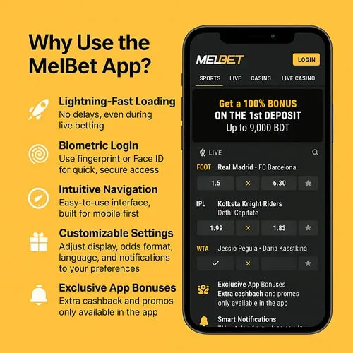 The MelBet mobile app is built for speed, simplicity, and full betting power on the go. Here's why Bangladeshi players love it: